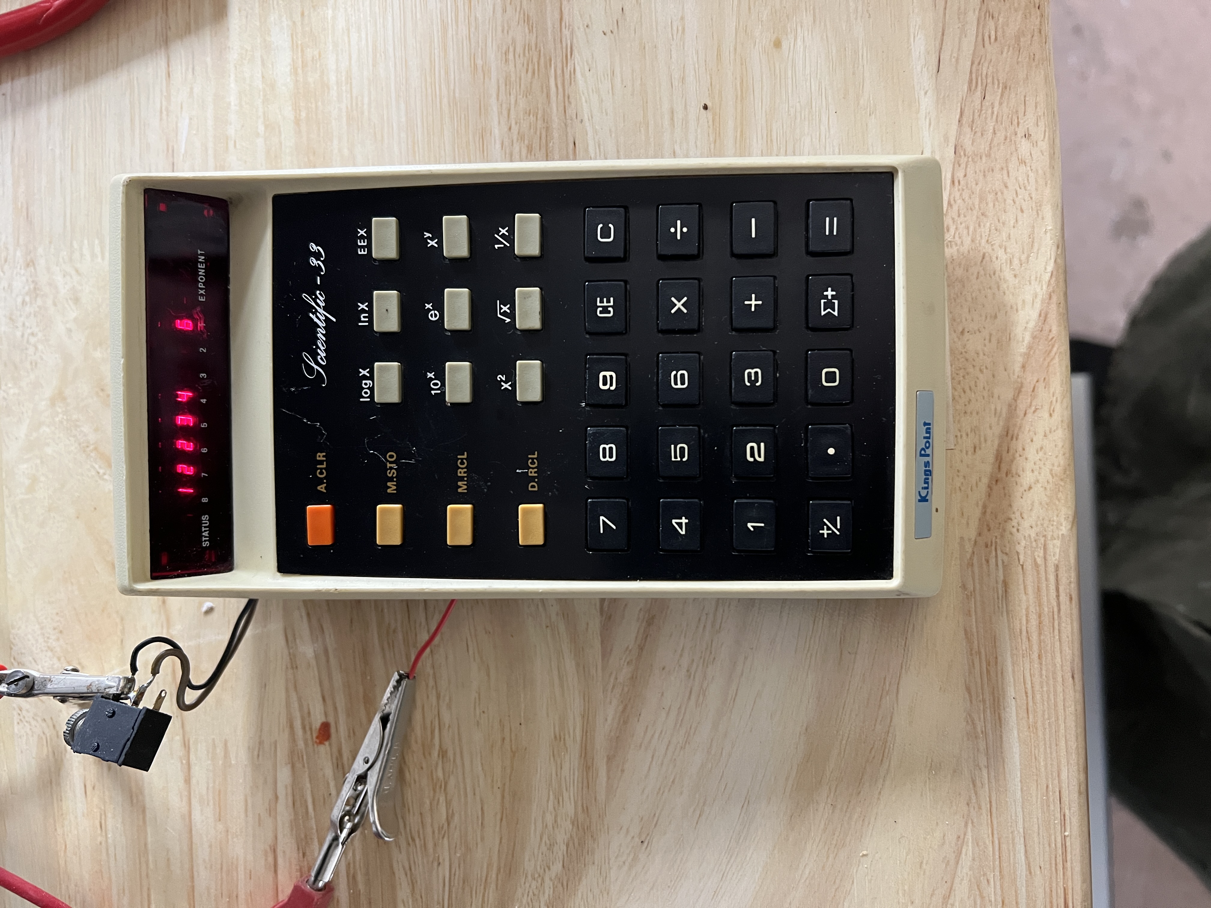 | Etat | Partiellement fonctionnelle : KO en alimentation via le jack externe mais s'allume en l'alimentant en 3,8V sur la connexion batterie (fil rouge interne et fil noir jack)? Des digits non allumés toutefois mais calculs corrects |